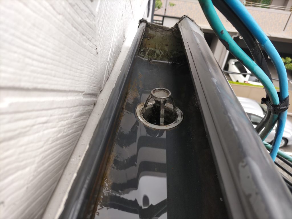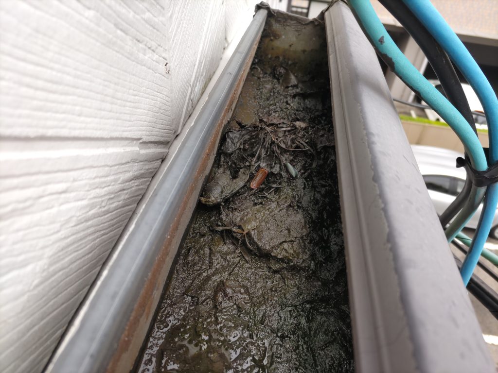 軒樋の落口部分が詰まってしまい排水されず雨水が樋から溢れ出ている状態でした。ご自宅周りに木が無くても鳥がゴミを運んで来たりするので何年も放置すると意外と詰まったりするのでご注意ください。